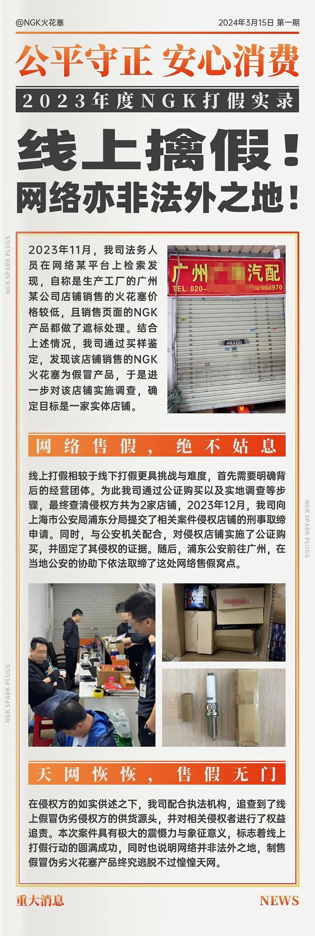 公平守正,安心消费,一年一度的3.15已至,一同与NGK回顾2023年度打假实录吧。2023年全年,NGK共调查和查处案件20件!成功查扣假冒NGK火花塞产品近50万支!涉案金额超5000万!(按NGK销售价格计算)